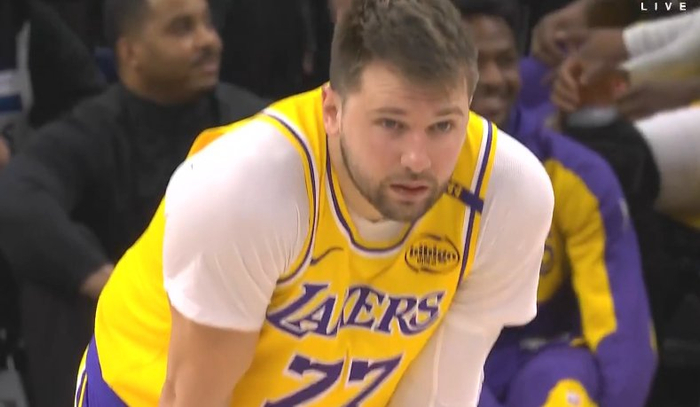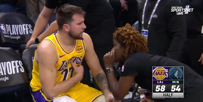 半场休息时,胃部不舒服的东契奇回到替补席与队医交流。