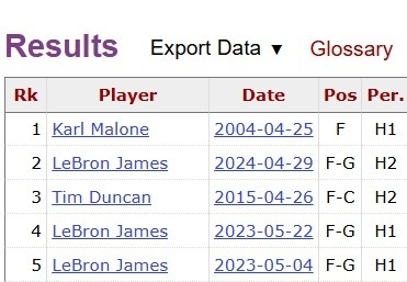 这样一来,詹姆斯(40岁117天)成为了季后赛历史半场砍下20+第二老的球员,仅次于2004年4月25日的卡尔-马龙(40岁276天)!