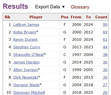 据统计,这是詹姆斯职业生涯至今季后赛拿到的第100次半场20+(该数据统计开始于1997年),NBA历史断档排名第一!