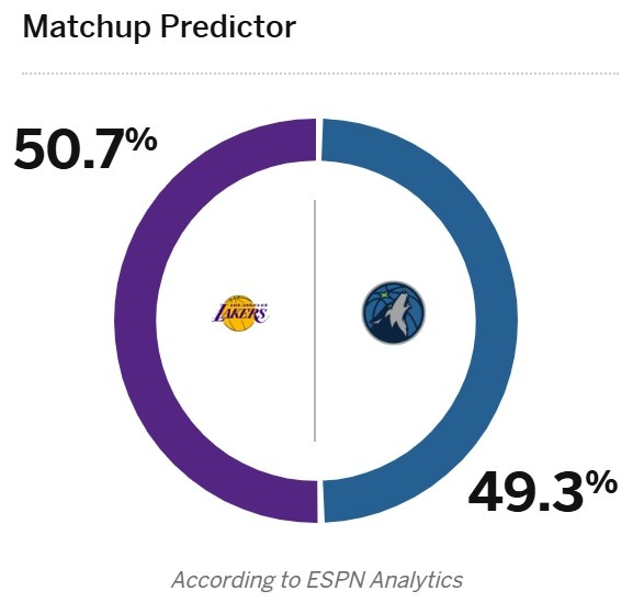 ESPN更新了两支球队G4的胜率,其中湖人50.7%略占优势,森林狼49.3%。
