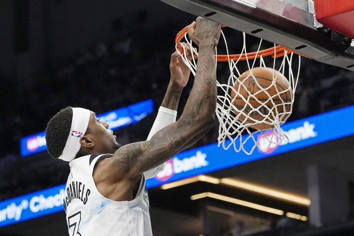麦克丹尼尔斯出战38分钟22投13中,三分5中1、罚球4中3拿到30分5篮板1助攻2抢断,正负值+11。