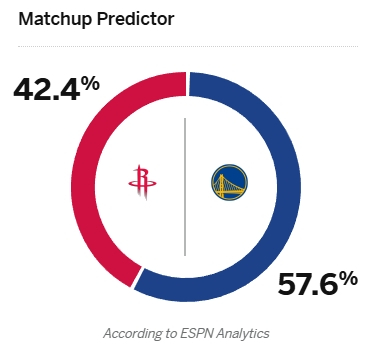 ESPN赛前更新预测两队G3获胜概率:勇士57.6%、火箭42.4%。