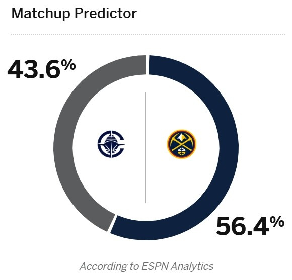 ESPN预测本轮系列赛天王山之战的胜率,其中,掘金(将有主场优势)56.4%被看好,快船43.6%。