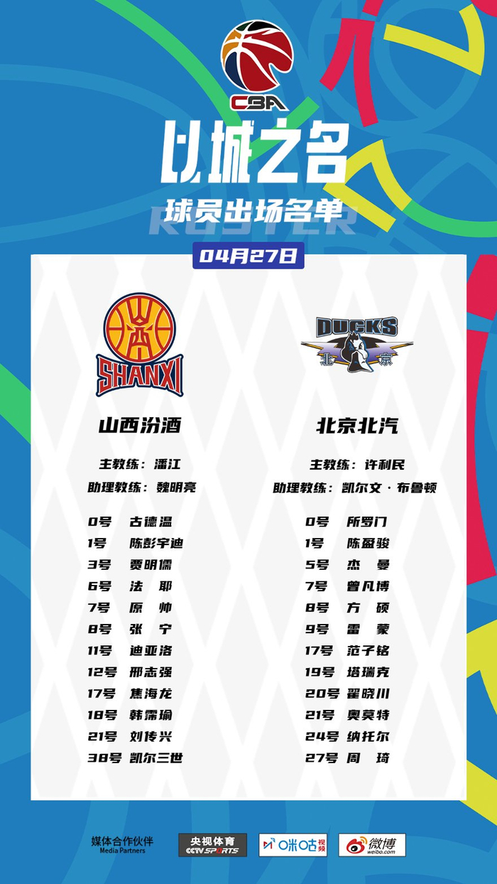直播吧4月27日讯 CBA半决赛北京VS山西系列赛G1,现场大名单出炉。