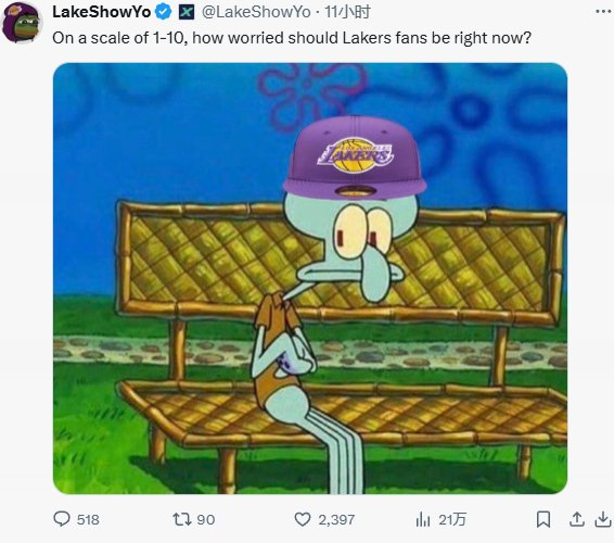 赛前,湖人自媒体LakeShowYo发推提问:“以 1 到 10 为标准,湖人球迷现在应该有多担心?”