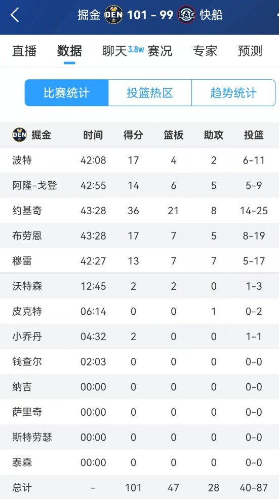 直播吧4月28日讯 昨天掘金客场101-99险胜快船,将大比分扳为2-2。