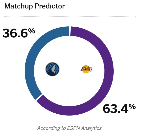赛后,ESPN更新了两队G5的胜率,其中,湖人63.4%被看好,森林狼36.6%。