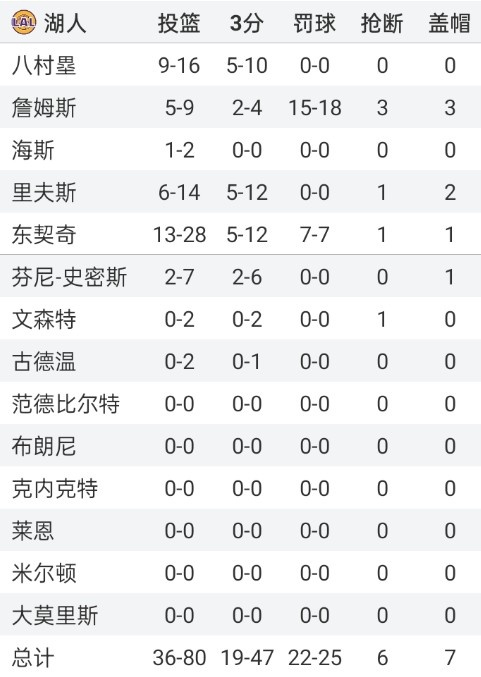 值得一提的是湖人这些罚球全部来自詹姆斯和东契奇两人,其中詹姆斯18罚15中,东契奇7罚7中。