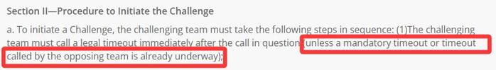 官方规则写道:“为触发教练挑战,挑战的球队必须立即叫出暂停,但例外情况为此前已经进入官方暂停或者对方球队已经叫出暂停,此时没有叫暂停的球队也可在此期间进行教练挑战。”