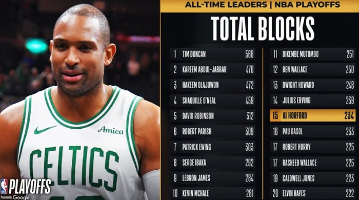 目前,霍福德已经送出了3记盖帽,他的季后赛盖帽总数来到234记,超越保罗-加索尔,上升至NBA历史第15位。