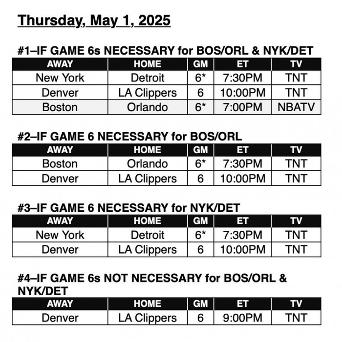 直播吧4月28日讯 今天,NBA官方公布了季后赛首轮G6在5月2日这天的比赛时间安排,具体如下:
