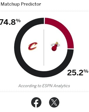 美媒ESPN对本场战果进行了预测,骑士胜率高达74.8%,热火胜率仅为25.2%。