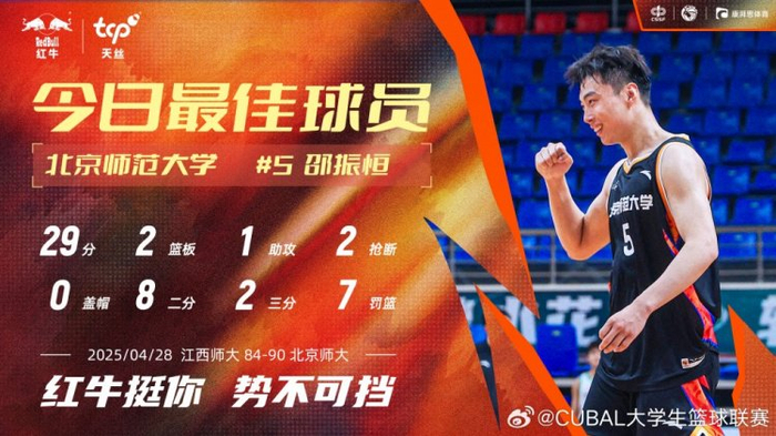 29分2抢断!CUBAL今日最佳球员:北京师范大学5号邵振恒