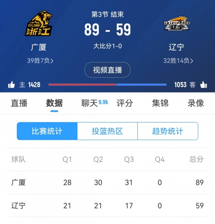 直播吧4月28日讯 CBA季后赛半决赛G2,广厦三节打完89-59领先辽宁。