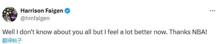 回到今天的案例,湖人球迷在得到一个确认被黑了的结果时,可能心里会稍微好过一些——湖人随队记者Harrison Faigen就转发了裁判报告,并写道:“嗯,我不知道你们怎么样,但我现在感觉好多了,谢谢NBA!”