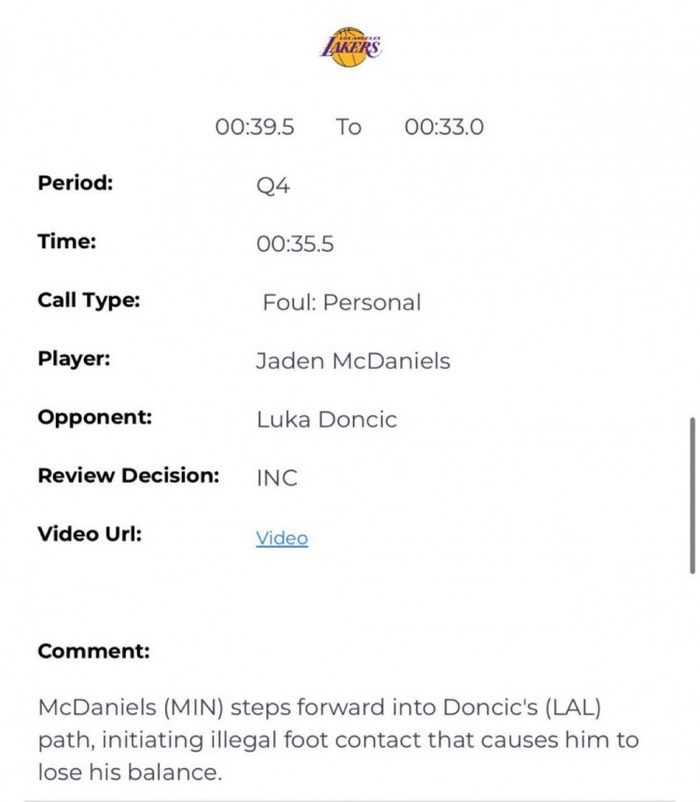 就比如在本文提及的这个漏判中,裁判报告就解释说:“麦丹向前踏进了东契奇的行进路线里,违规的脚部接触导致东契奇失去了平衡。”——这便是这个判罚应有的判罚依据。