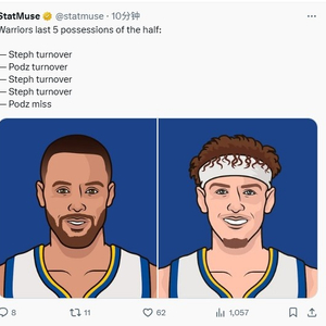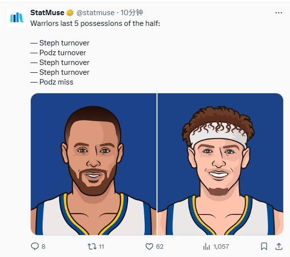 上半场勇士最后5个进攻回合全部无功而返,其中库里3次失误,波杰姆斯基1次失误1次投篮不中。