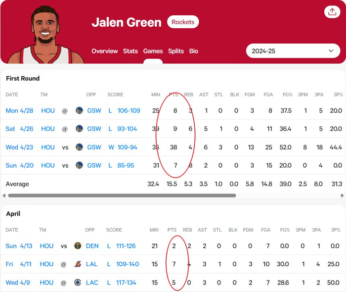 值得一提的是,杰伦-格林在过去7场比赛里,总计得到76分。其中对阵勇士的G2得到38分,其余6场合计38分。