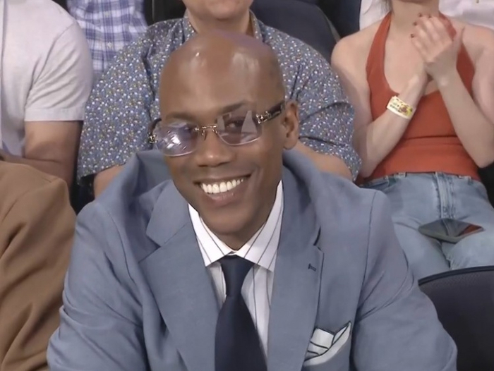 牙齿贼拉白!马布里场边观战尼克斯VS活塞 露出灿烂笑容