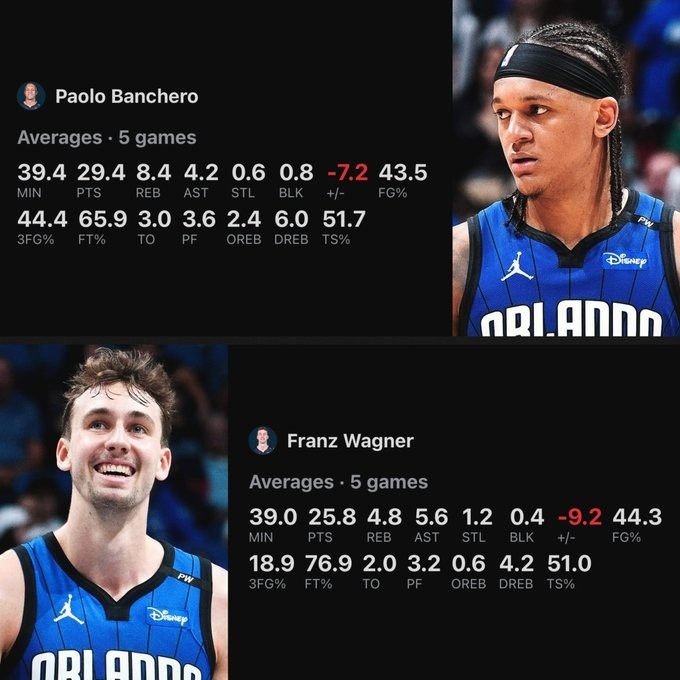 这轮系列赛,班凯罗场均29.4分8.4篮板4.2助攻,小瓦格纳场均25.8分4.8篮板5.6助攻。