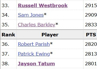 塔图姆季后赛总得分超越尤因/帕里什/巴克利 上升至NBA历史第35位