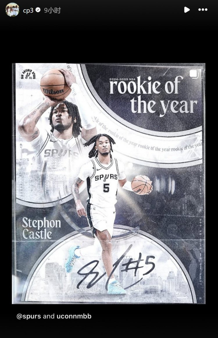 克里斯-保罗在INS转发了相关海报,对卡斯尔表示祝贺。
