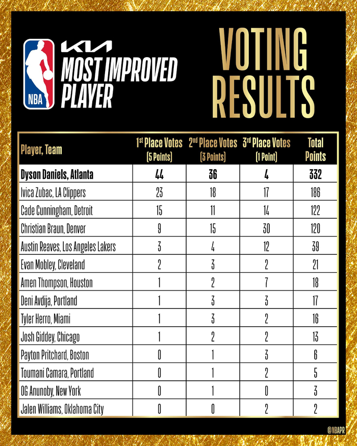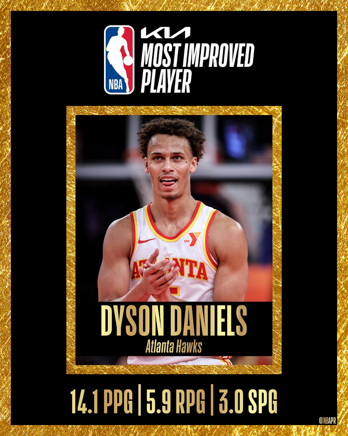 直播吧05月01日讯 NBA官方公布了本赛季最快进步球员,老鹰后卫戴森-丹尼尔斯当选。