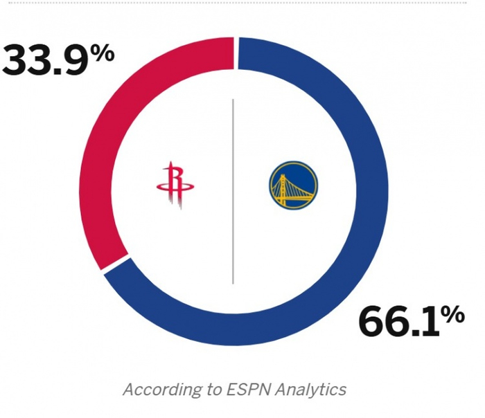 下一场结束系列赛?ESPN预测G6胜率:勇士66.1% 火箭33.9%