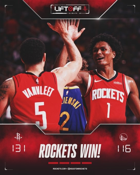 赛后,火箭官方发布赢球海报,范弗里特和阿门击掌瞬间成为封面。