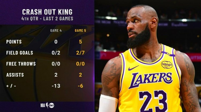 本轮系列赛最后2场的第四节,詹姆斯一次2中0、一次7中2,合计仅得5分,转播方TNT晒出了上述数据,文案也很大胆:“乏力的国王。”