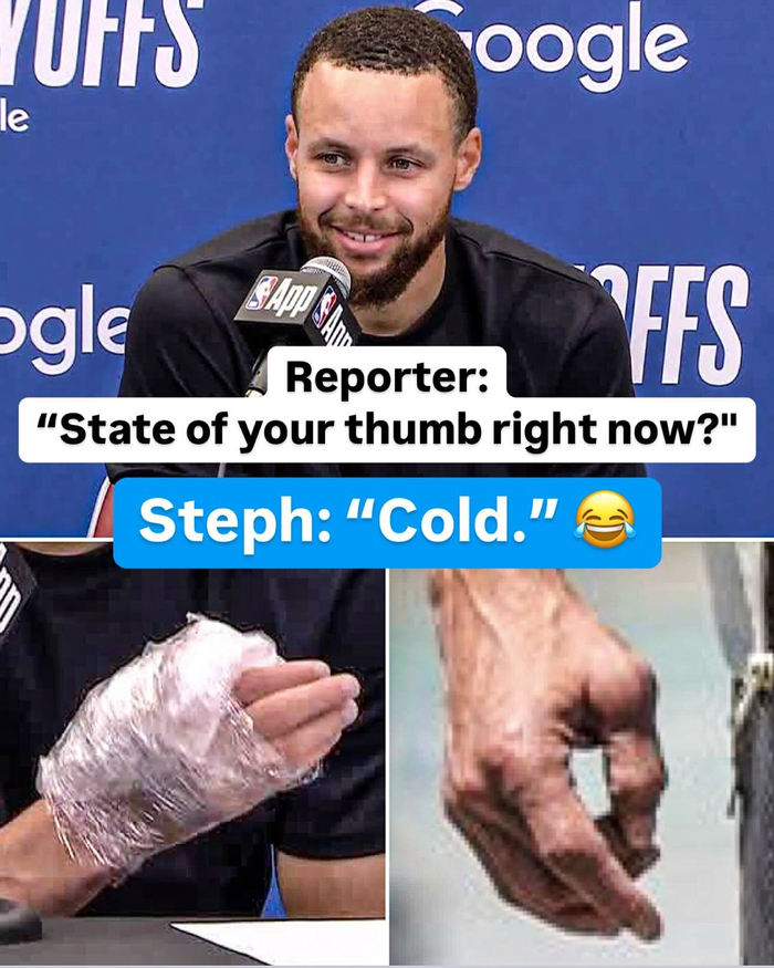 赛后,记者问库里受伤拇指的感觉,库里打趣道:“冷。”