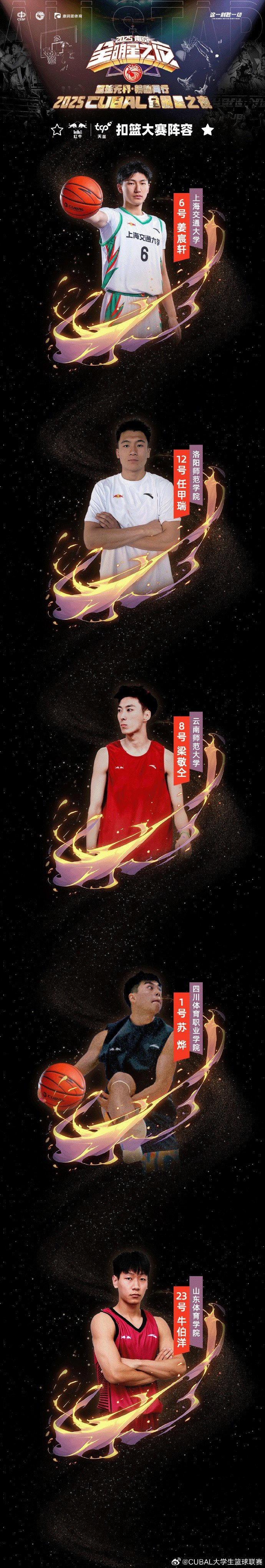 CUBAL扣篮大赛名单:姜宸轩、牛伯洋、梁敬仝、苏烨、任甲瑞