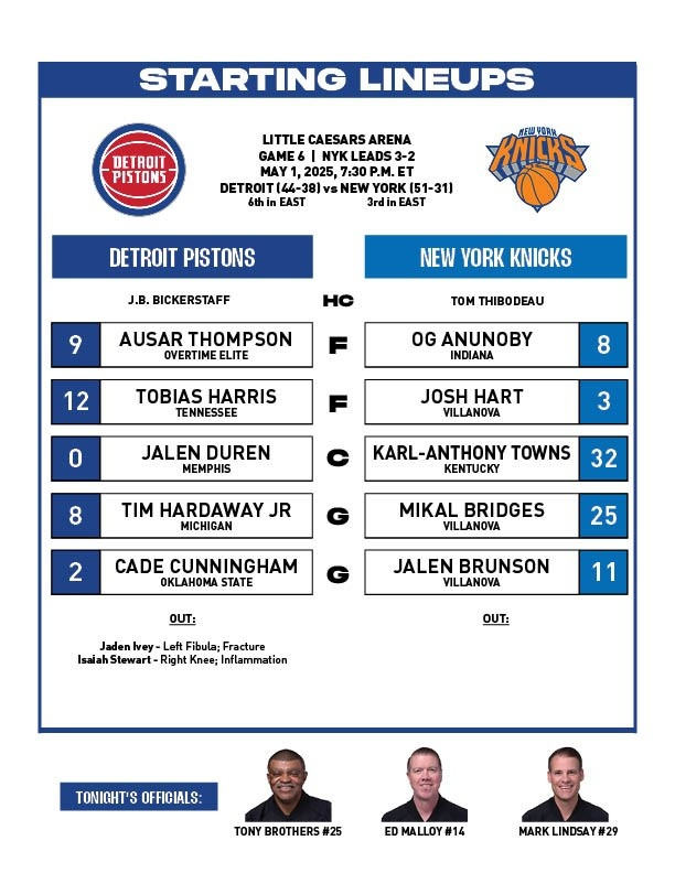 直播吧5月2日讯 NBA季后赛东部首轮G6,尼克斯与活塞的比赛即将打响。
