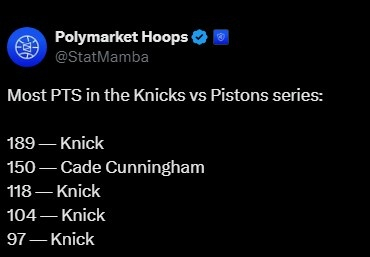 据统计,本次系列赛总得分前五名仅康宁汉姆一名活塞球员,其他四位都是尼克斯球员。