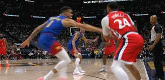 小波特防鲍威尔球出界判快船球 掘金挑战成功拿回球权