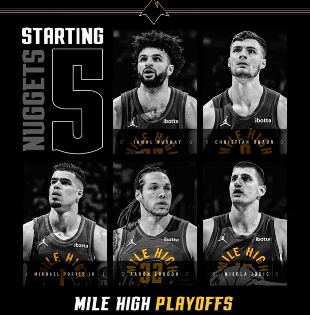 赛前掘金公布了本场比赛首发:贾马尔-穆雷、布劳恩、小迈克尔-波特、阿隆-戈登、约基奇。