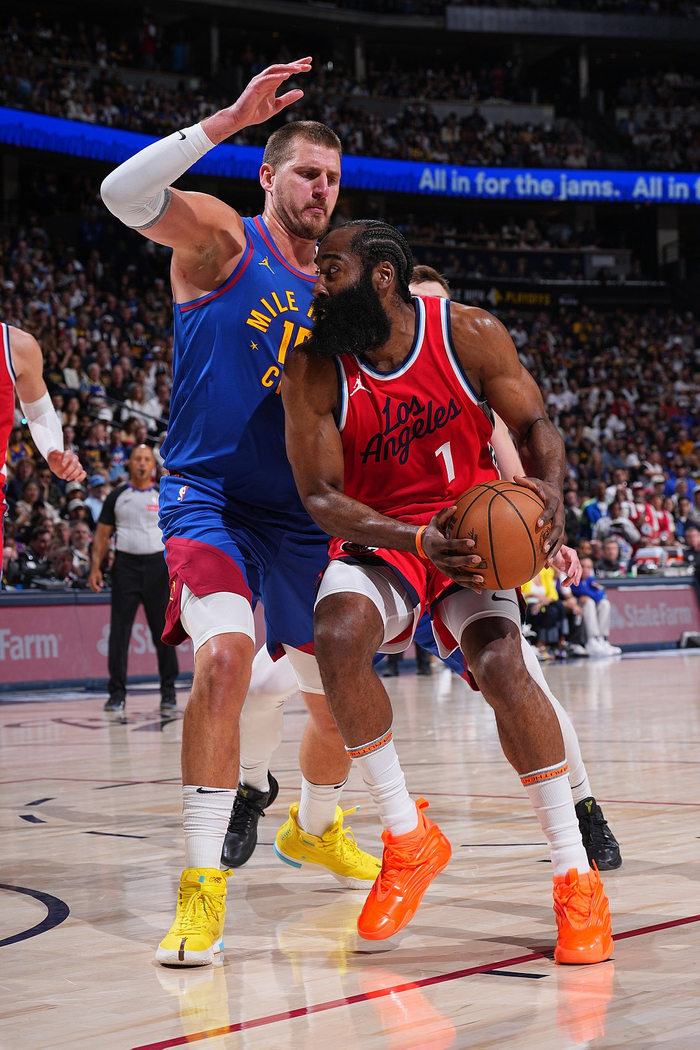 在防守端,哈登大量参与换防戈登/约基奇,这个年纪和腿脚确实跟不上速度型外线,低位当肉盾2断1帽在防守端也算尽力竭力。