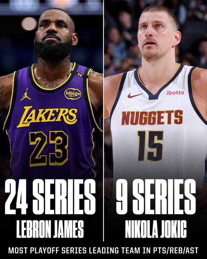 据统计,这是约基奇生涯第9次在系列赛中得分、篮板、助攻均领跑全队,排名历史第二,仅次于勒布朗-詹姆斯(24次)。
