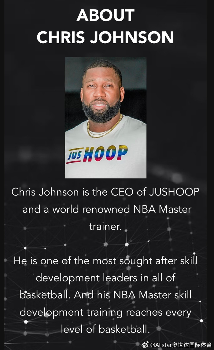 本次特训总训练师为克里斯-约翰逊(Chris Johnson),曾训练过詹姆斯、韦德、保罗、巴特勒、杰伦布朗等众多nba球星。