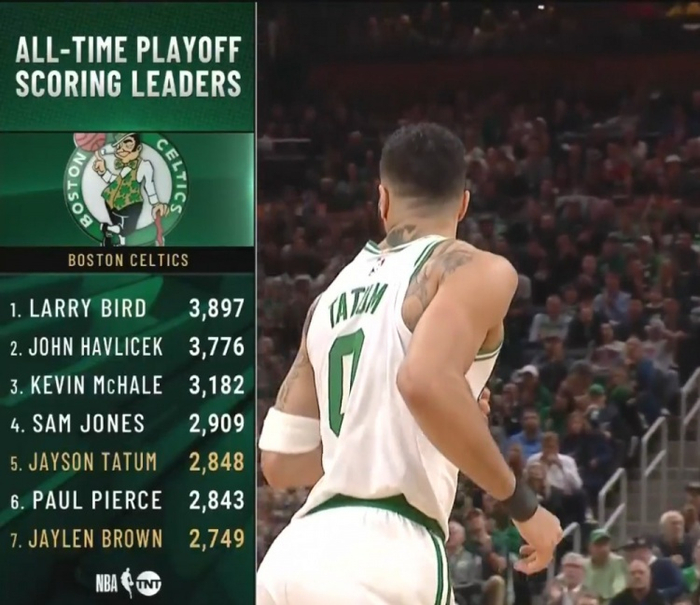目前,塔图姆已经得到13分,他在凯尔特人的季后赛总得分来到2848分(赛前为2836分),超越保罗-皮尔斯,上升至凯尔特人队史第五位,前一位是萨姆-琼斯。