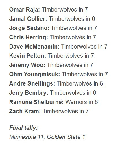 ESPN记者团预测狼勇:11人看好森林狼 1人看好勇士