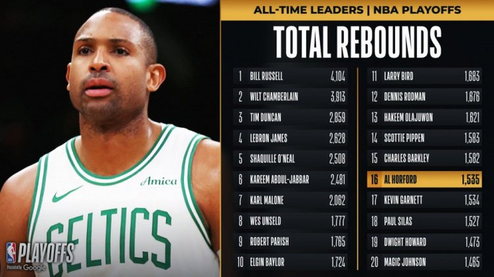 据统计,霍福德季后赛生涯总篮板来到了1536个(图片数据是比赛进行中的),超越加内特位居历史第16位。
