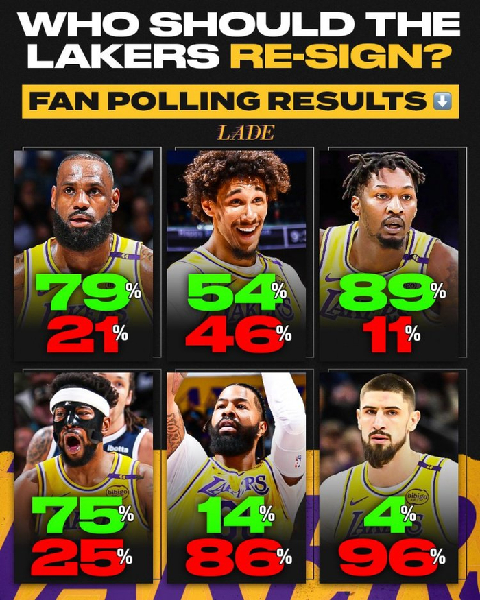 对于本赛季休赛期湖人潜在的自由球员(包括到期合同和拥有球员选项的球员),该自媒体博主调查了湖人球迷是否希望他们下赛季回归球队。结果如下: