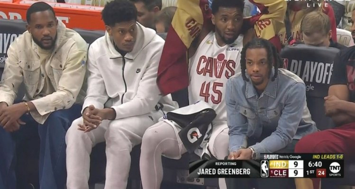 😫靠你了!三大主力病患加兰&莫布里&亨特替补席围坐米切尔两侧