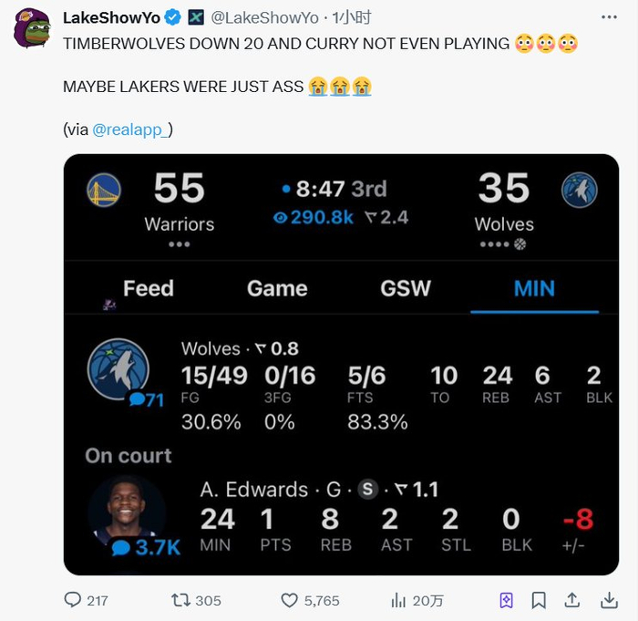 😫湖媒:库里不打森林狼都能落后勇士20+ 可能湖人就是垃圾吧