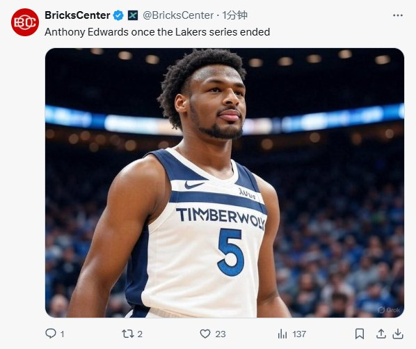 本场比赛,森林狼后卫安东尼-爱德华兹状态全无,进攻端频频受阻。上半场他颗粒无收8投全失,仅靠罚球得到1分。媒体BricksCenter更新了社交媒体,发文:“结束与湖人系列赛后的爱德华兹。”并配图(如上)。