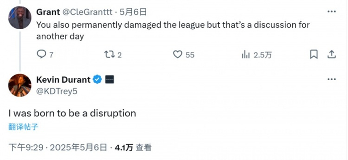 网友:你加盟勇士永久性地损害了NBA KD回复:我生来就是为了颠覆