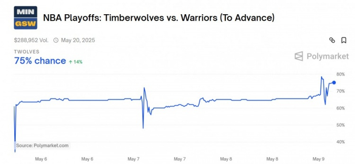 据数据媒体Polymarket Hoops实时统计,目前森林狼拿下本轮系列赛的概率高达75%!