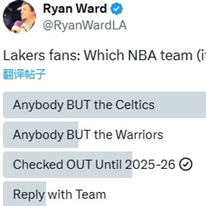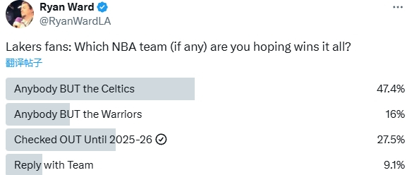 湖记:湖人球迷你支持谁夺冠? 选项A:除了绿军&选项B:除了勇士 NBA综合 2025.05.0911:06 关注 直播吧05月09日讯 今日,湖人记者Ryan Ward发起投票:湖人球迷,你支持哪只球队赢得总冠军?【来源:直播吧】