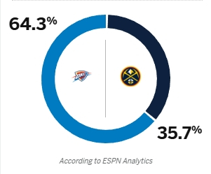 乘胜追击or触底反弹?ESPN预测雷掘G3胜率:雷霆64.3% 掘金35.7%